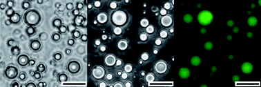 Using a range of physical methods, we describe the formation, structure, stability, physical properties and uptake behavior of condensed liquid micro-droplets prepared by electrostatically induced complexation of poly(diallyldimethylammonium) chloride (PDDA) and adenosine triphosphate (ATP) in water. Depending on the PDDA monomer: ATP molar ratio, positively charged or charge-neutral droplets are produced spontaneously by simple mixing. The former are typically 60–600 nm in mean size and stable with respect to sedimentation up to temperatures of 85 °C, whilst the latter grow into droplets several tens of micrometres in diameter that coalesce into a macroscopic coacervate phase. Coacervation is inhibited at pH values less than 3 and at high ionic strength, confirming the importance of charge interactions in droplet formation and stability. The droplet interior is structurally homogeneous with no surrounding membrane, comprises dynamically fluctuating domains of partially desolvated polymer/nucleotide complexes, and has a dielectric constant considerably lower than water. As a consequence, dye molecules, porphyrin macrocycles, inorganic nanoparticles or globular proteins can be sequestered from the external water phase into the droplets to produce PDDA/ATP droplets comprising supramolecular J-aggregate nanostructures, magnetically responsive deformable fluids, or soft compartments with potential storage and release properties.