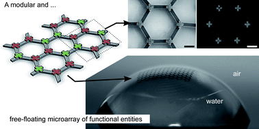 In the present paper, we report a method for fabricating a macroscopic, free-floating device that supports a microarray of molecular functional entities. Therefore, the fabrication process developed by us combines bottom-up and top-down microfabrication strategies for a spatially controllable integration of molecular entities into the macroscopic device. For application, the generated device is transferred to fluid interfaces. Through a combined experimental and theoretical study, we demonstrate that the microscopic cavities of the intrinsically hydrophilic comb-shaped mesh structure enable the flotation of the device at a water–air interface of a sessile droplet due to surface tension effects. The design of the functionalized and free-floating device affords a long-term stable approach with respect to a chemical patterning of this fluid interface without loss of the lateral arrangement of the functional entities over time.